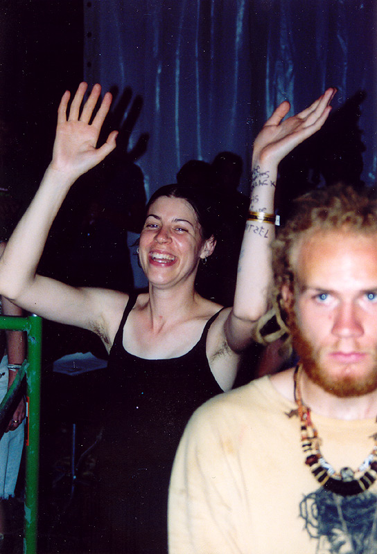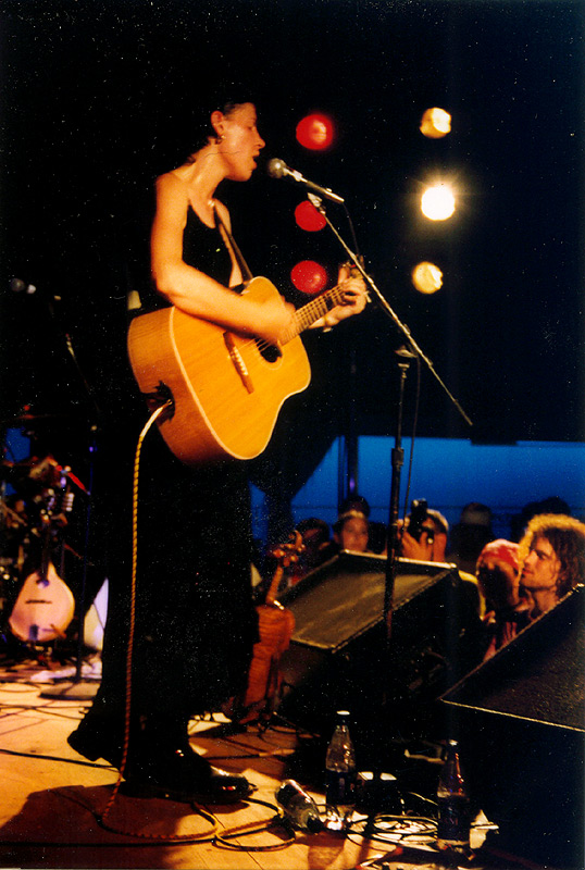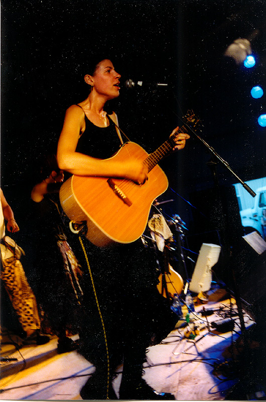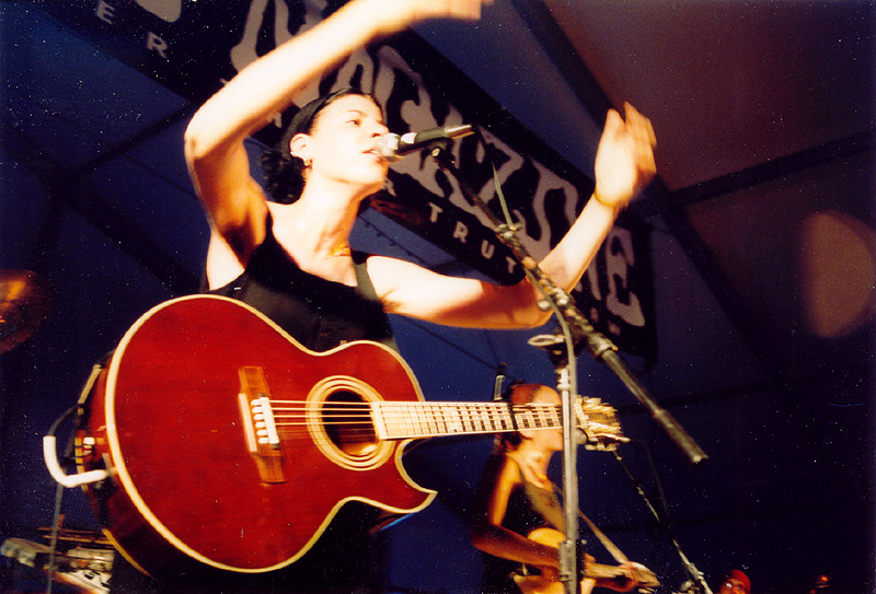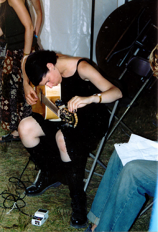 | …not much has changed in a year since Miranda last played here; her legs are still nicely hairy and she's still breaking guitar strings. Here she is repairing one that broke during sound check. |