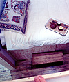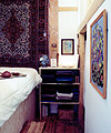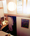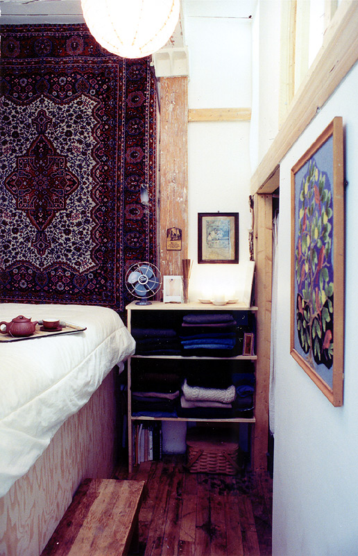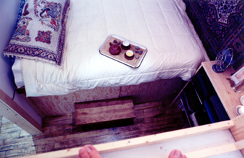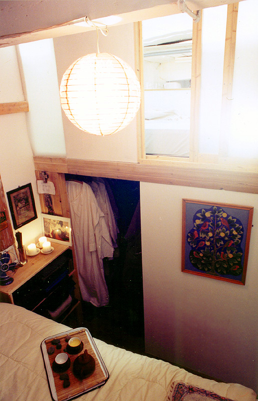 Because you can never get enough storage space in a loft situation like this, I built the bed high off the floor, with a stool to climb up. It's a tiny but cozy space, perfect for drinking tea and writing. |
