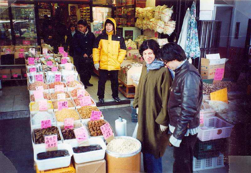 | I've fallen in love with Toronto not just because it's so accessible to out-of-town visitors and touring musicians who need a place to stay, but also because there are so many cultures represented. I regularly do my food shopping in both the east and west China towns, for fun Asian cooking experiments. Singer/songwriter Tom Conlon came up to Toronto for some winter vacation and I took him around to the variety of Chinese dried goods stores on Spadina Ave. Here, he's checking out the dried sea cucumber, which I told him were sun-dried bull penises'.